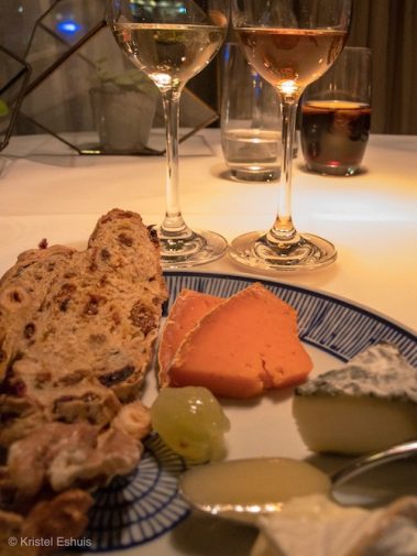 Als ik de kans krijg, zal ik in een restaurant altijd eerder voor de kaasplank dan voor een zoet dessert gaan. Het kaasplateau bestond uit 5 verschillende kazen met mispelcompote, wijnruitstroop en powerfruitbread. De kazen zijn lekker, goed op elkaar afgestemd in oplopende sterkte en er worden 2 verschillende wijnen bij geschonken die ook weer prima passen bij de kazen.